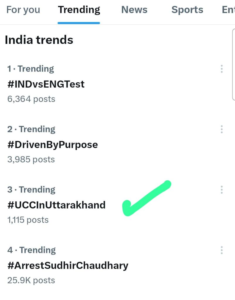 उत्तराखंड के मुख्यमंत्री पुष्कर सिंह धामी को ठीक 20 माह बाद देश के सबसे बड़े कानून समान नागरिक संहिता (यूसीसी) का ड्राफ्ट मिल गया है। यह ड्राफ्ट मुख्यमंत्री धामी के राज्य के विकास को लेकर लिए गए बड़े संकल्पों में से एक है। शुक्रवार को जैसे ही यूसीसी की कमेटी ने ड्राफ्ट मुख्यमंत्री को सौंपा तो सोशल मीडिया में “हैशटैग यूसीसी इन उत्तराखंड” तेजी से ट्रेंड हो गया। देखते ही देखते ड्राफ्ट के समर्थन में देशभर से सोशल मीडिया इंफ्यूलेन्सर से लेकर बड़ी शख्सियत, विचारक एवं टिप्पणीकार आगे आ गए। सोशल मीडिया में ट्वीट, पोस्ट, शेयरिंग, ग्रफिक्स, वीडियो के साथ यूसीसी पर धामी सरकार के निर्णय का समर्थन होने लगा। हर कोई इस फैसले पर मुख्यमंत्री धामी के मुरीद दिखे और बेबाकी से लिखते गए कि समान नागरिक संहिता कानून समय की जरूरत है। खासकर यूसीसी के समर्थन में सबसे ज्यादा लोग सोशल मीडिया एक्स( X) पर ट्रेंड करते नजर आये।अक्सर सोशल मीडिया में अपनी बात बेबाकी से रखने वाली इनफ्लुएंसर्स प्रीति गांधी ने ट्वीट करते हुए लिखा कि “प्रधानमंत्री नरेंद्र मोदी जी का “एक भारत-श्रेष्ठ भारत” का विजन सच में बदल रहा है।” इसी तरह इंफ्लुयेंसर रमेश सोलंकी ने लिखा कि “समृद्धि और समानता की दिशा में यूसीसी से देवभूमि एक समृद्ध समाज की ओर कदम बढ़ा रहा है।” सौरभ गुप्ता नाम के यूजर ने ट्वीट पर मुख्यमंत्री धामी के इस ऐतिहासिक निर्णय हेतु बधाई देते हुए लिखा कि “निश्चित तौर पर यह सभी नागरिकों को समान अधिकार प्रदान करने की दिशा में महत्वपूर्ण कदम है, जल्द ही यूसीसी को कानून बनाकर उत्तराखंड में लागू भी कर दिया जाएगा।” इधर, उत्तराखंड भाजपा ने भी सरकार की इस उपलब्धि पर ट्वीट करते हुए लिखा कि आगामी विधानसभा सत्र में भाजपा सरकार समान नागरिक संहिता का विधेयक पेश कर अतिशीघ्र कानून के रूप में लागू करने की ओर कदम बढ़ाएगी। इसके साथ ही उत्तराखंड सरकार में कैबिनेट मंत्री गणेश जोशी, विधायक सुरेश गडिया जैसे तमाम नेताओं, मीडिया से जुड़े लोग भी धाकड़ धामी की इस मुहिम के समर्थन में ट्वीट करते हुए मुरीद दिखे।