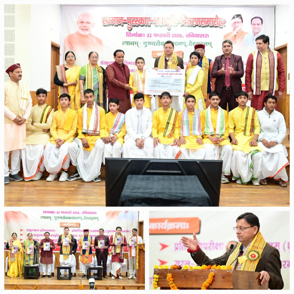 मुख्यमंत्री पुष्कर सिंह धामी ने मुख्यमंत्री कैम्प कार्यालय स्थित मुख्य सेवक सदन में संस्कृत छात्र प्रतिभा सम्मान कार्यक्रम में भाग लिया। इस अवसर पर उन्होंने गार्गी बालिका संस्कृत छात्रवृत्ति, डॉ. भीमराव अंबेडकर अनुसूचित जाति, अनुसूचित जनजाति संस्कृत छात्रवृत्ति भी विद्यार्थियों को प्रदान की। कार्यक्रम के दौरान मुख्यमंत्री ने प्रतियोगी परीक्षा स्वाध्याय केन्द्र एवं ई-संस्कृत संभाषण शिविर का वर्चुअल शुभारंभ और उत्तराखण्ड संस्कृत विश्वविद्यालय के त्रैमासिक पत्र संस्कृत वार्ता का विमोचन भी किया।