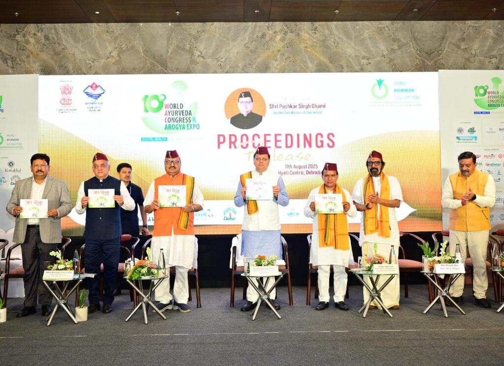 ओल्ड राजपुर स्थित एक होटल में 10वीं विश्व आयुर्वेद कांग्रेस एवं आरोग्य एक्सपो के प्रोसेडिंग विमोचन समारोह को संबोधित करते हुए, मुख्यमंत्री पुष्कर सिंह धामी ने कहा कि ये हमारे लिए अत्यंत गर्व का विषय है कि देवभूमि उत्तराखंड 10वीं विश्व आयुर्वेद कांग्रेस और आरोग्य एक्सपो का आयोजन करने में सफल रहा, साथ ही अब हम उस ऐतिहासिक आयोजन की स्मृतियों और उपलब्धियों को संजोने के लिए प्रोसिडिंग का विमोचन कर रहे हैं। उन्होंने कहा कि ये मात्र एक दस्तावेज नहीं बल्कि ज्ञान, अनुभव और गहन विचार-विमर्श का सार तत्व है, जो आने वाले वर्षों में आयुर्वेद के क्षेत्र में अनुसंधान, नीति-निर्माण और जन स्वास्थ्य की दिशा तय करने में अपनी महत्वपूर्ण भूमिका निभाएगा।