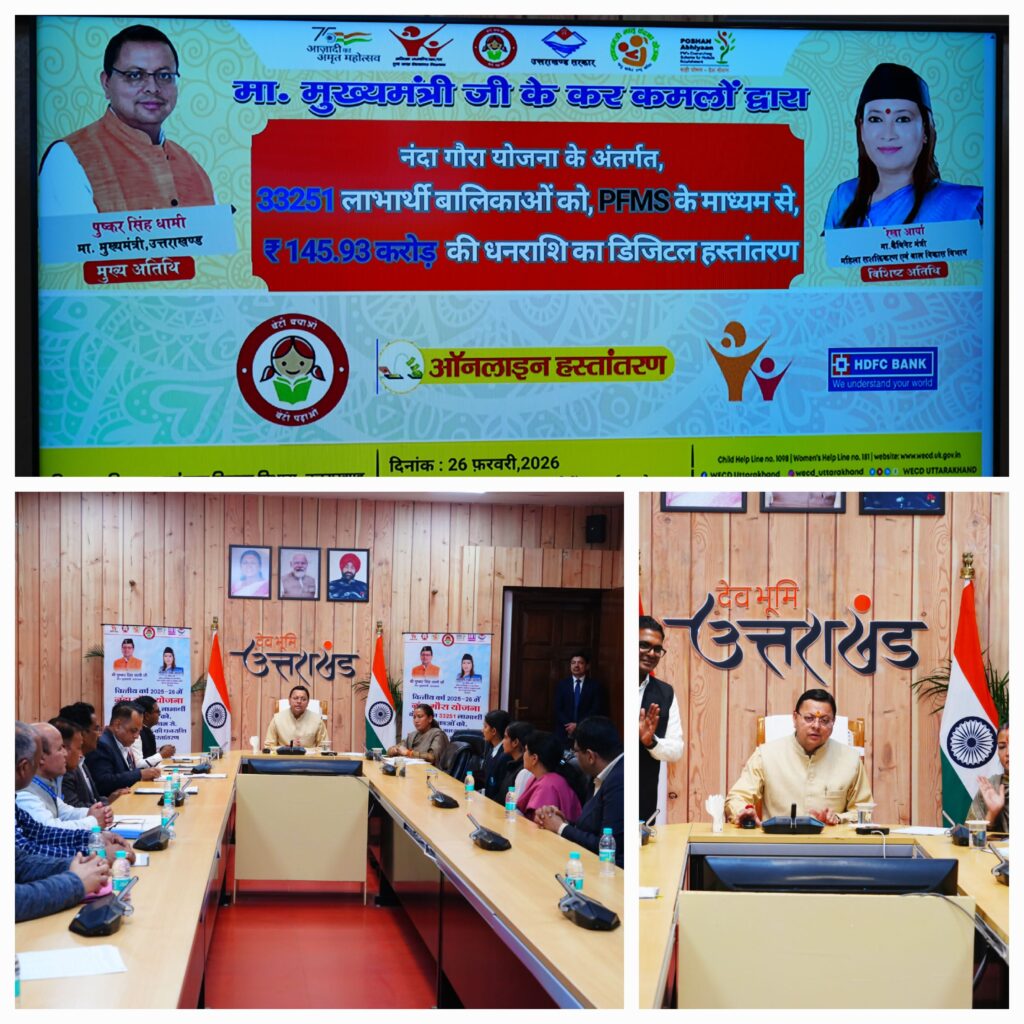 मुख्यमंत्री पुष्कर सिंह धामी ने कहा कि प्रदेश सरकार बेटियों के जन्म से लेकर उनकी शिक्षा, सुरक्षा और रोजगार को बढ़ावा देने के लिए संकल्पबद्ध होकर कार्य कर रही है। मुख्यमंत्री ने गुरुवार को नंदा गौरा योजना के तहत वित्तीय वर्ष 2025-26 के लिए प्रदेश की 33,251 बालिकाओं के खाते में डीबीटी के माध्यम से 1,45,93.00 (एक अरब पैंतालीस करोड़ तिरान्नबे लाख रुपए) की धनराशि हस्तांतरित की।